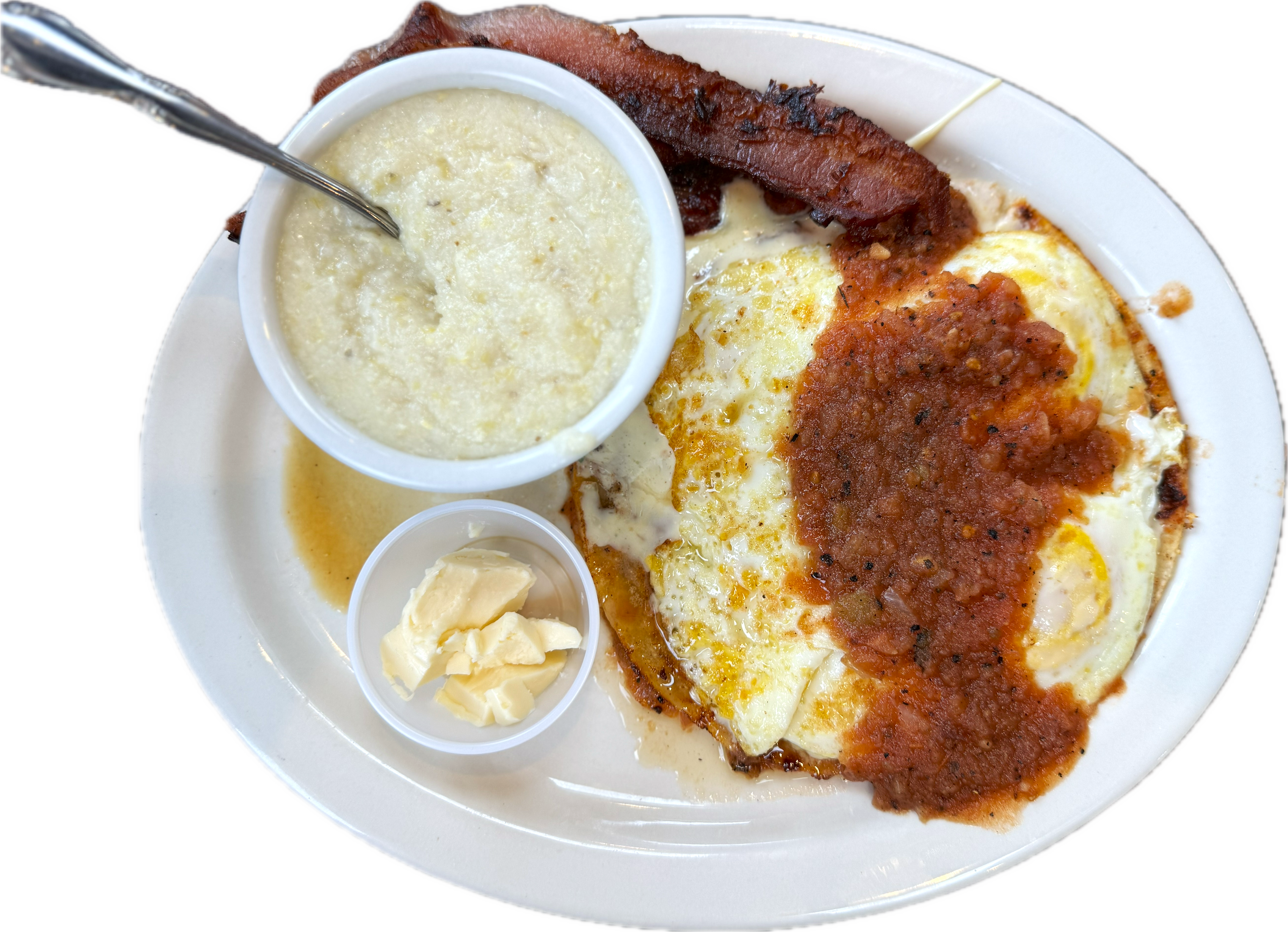 With fried okra, and green chile cheese grits, it’s $15.95. Huevos rancheros ($10.95) posits two salsa-dipped corn tortillas topped with queso, two eggs your style, with a salsa of properly charred tomatoes and chiles, and two bacon strips.