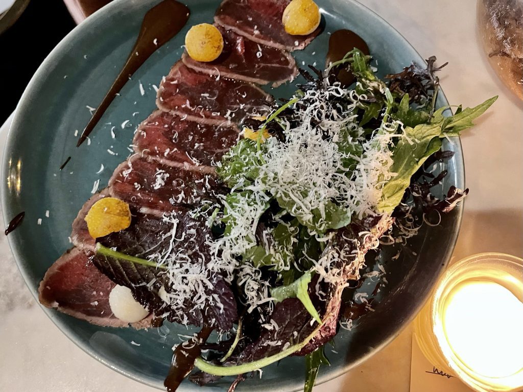 Nalbone’s desserts include tiramisu ($10) with malted milk mascarpone, chocolate ganache, and espresso, milk and honey panna cotta with grapes and halva, gelato in milk chocolate and toasted vanilla bean, and Concord grape sorbetto.
