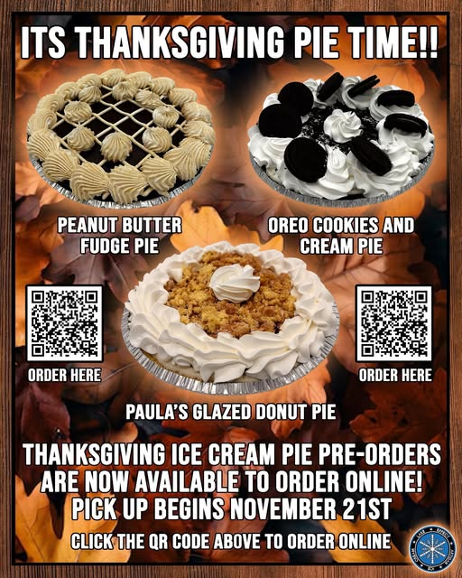 Paula’s glazed donut pie: Lake Effect Ice Cream’s Thanksgiving ice cream pie offerings include a doughnut crossover classic, a shortbread crust filled with Paula’s Glazed Donut ice cream, topped with crumbled Paula’s glazed fry cakes and finished with a whipped cream edge ($20).