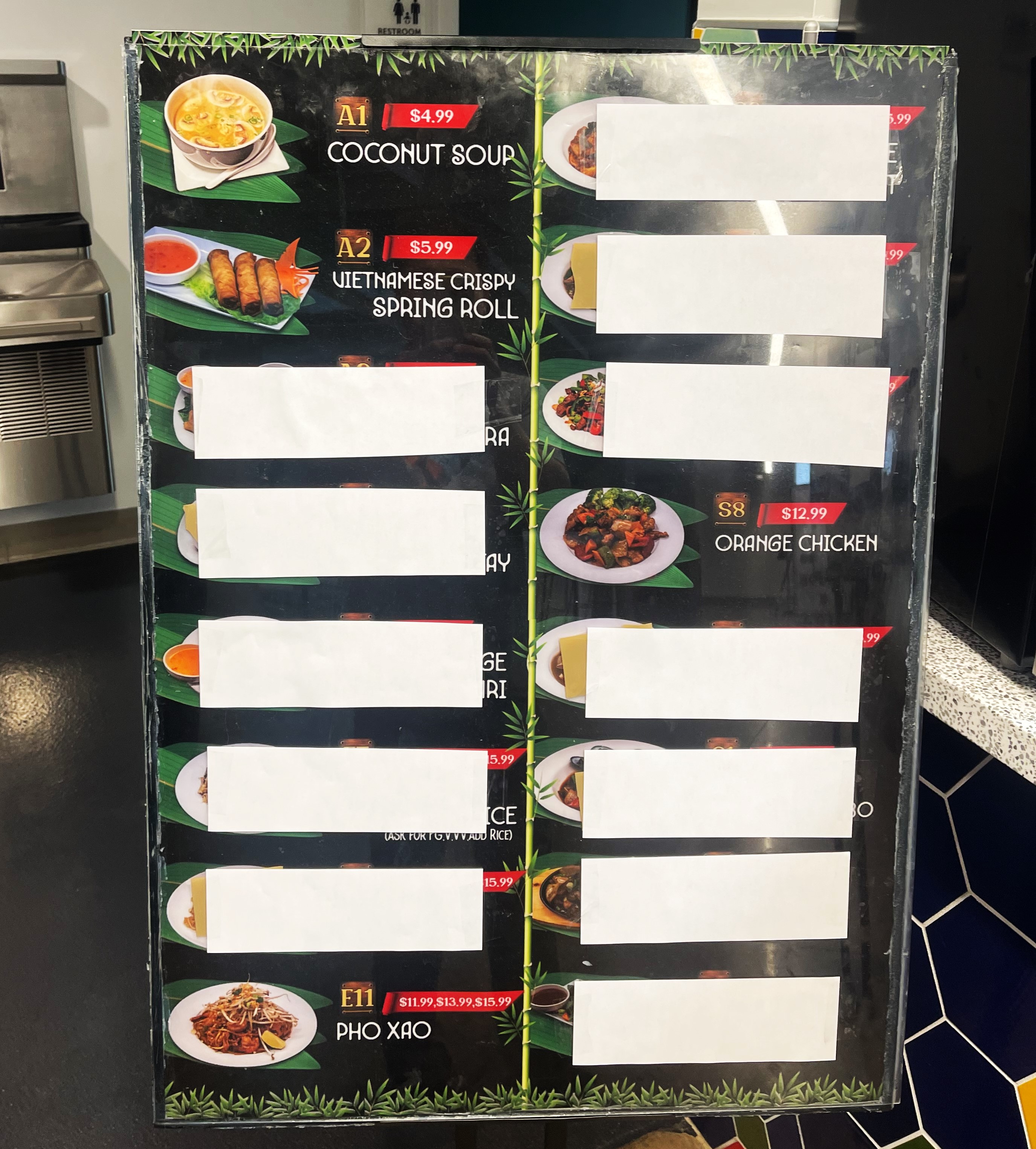 The next morning, Thu arrived to find thick white tape applied to his sign, obscuring the deleted dishes completely, and a warning from Carter to never go off-menu again. On April 30, Carter told him to remove the taped-over counter menu completely.