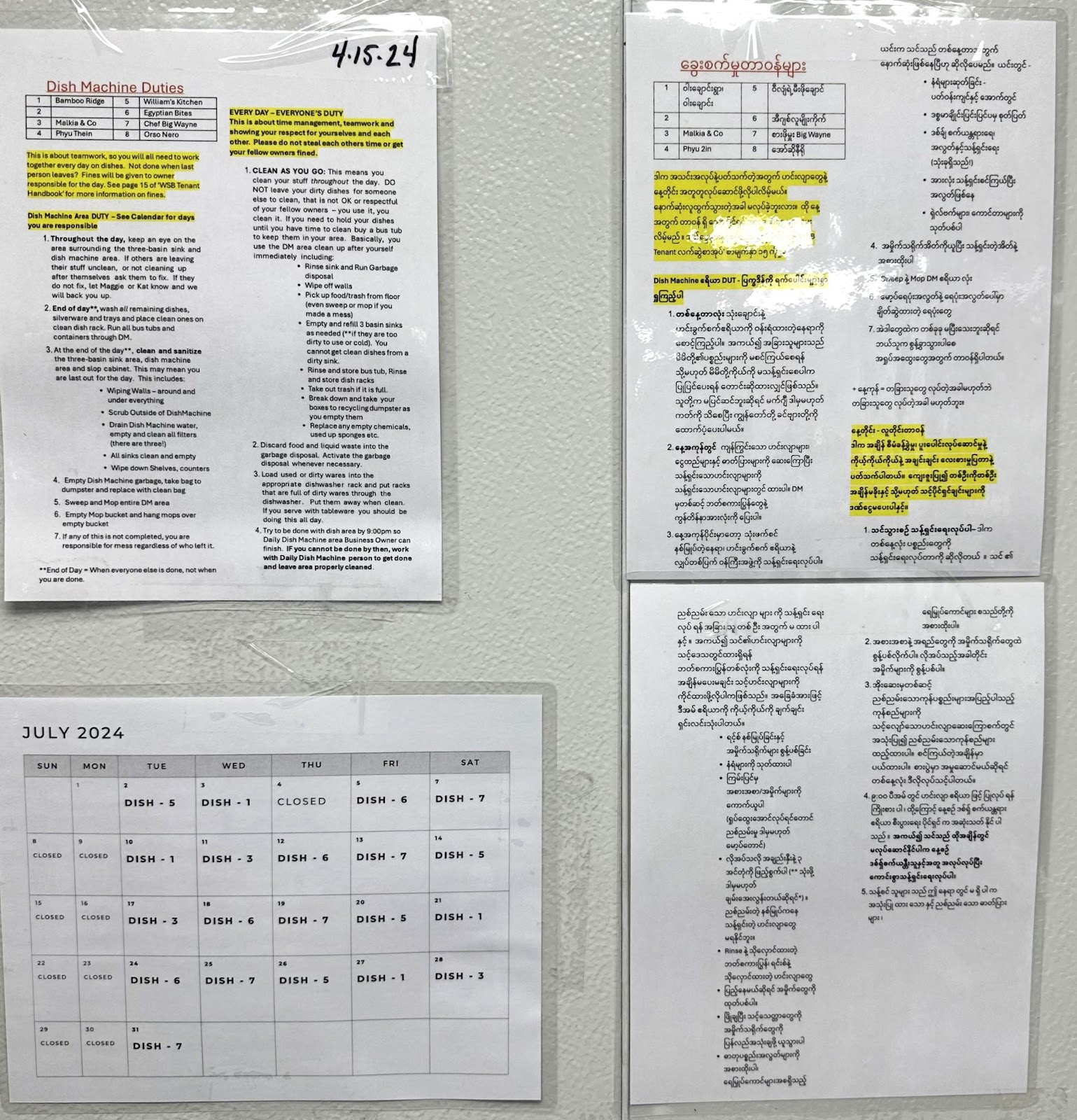 “WEDI shall provide appropriate interpretation and translation services upon request from any business at West Side Bazaar,” WEDI’s West Side Bazaar Tenant Handbook states. Tenants signed the handbook and were warned they would be held to what it said. It was never provided in Burmese, tenants said, though WEDI promised one.