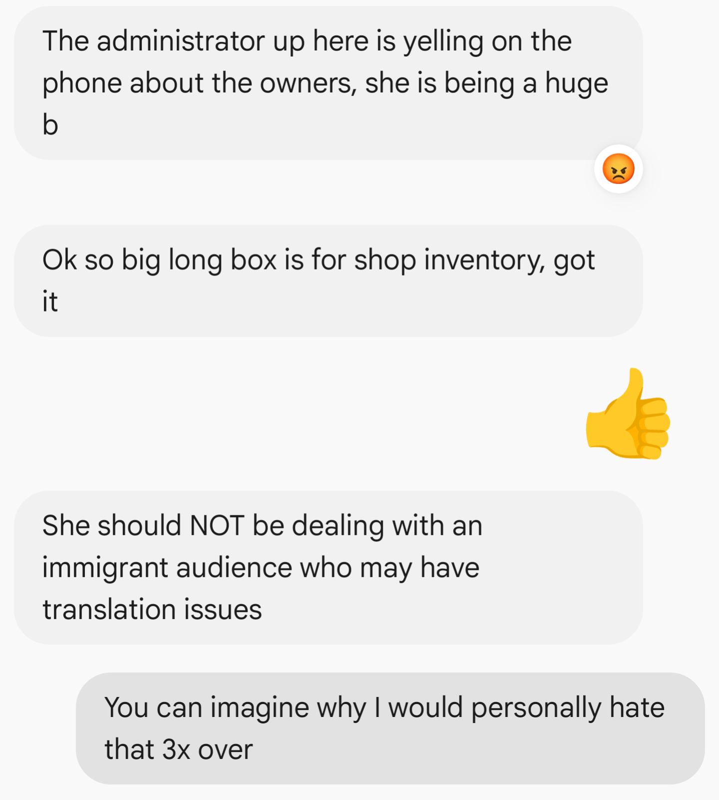 Text message from West Side Bazaar employee to business owner reacting to Kat Carter.