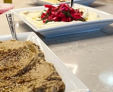 Charred eggplant babaganoush, labneh with pickled turnips. (Not shown: roasted garlic hummus with spiced mushrooms.)