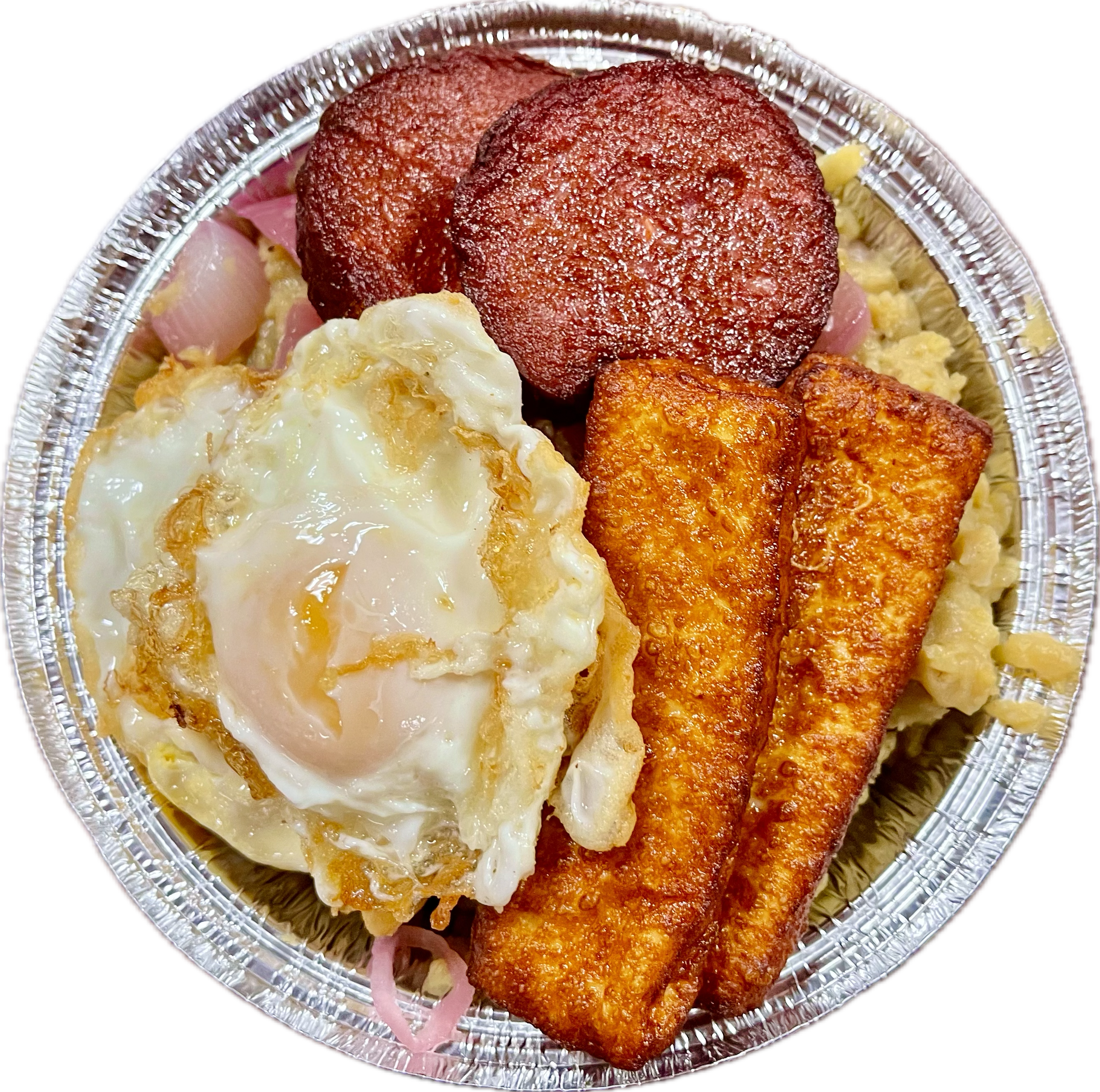 Fried salami, fried cheese, and fried egg is a Dominican breakfast known as “three hits” – tres golpes. It’s $10 over yuca potato’s more interesting cousin, cooked with vinegar and garlic, which is my favorite. The $8 version comes over mangu, seasoned mashed plantains.