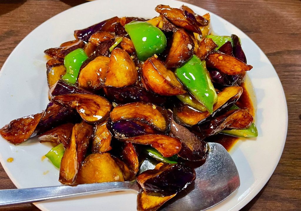 Deep-fried eggplant with hot garlic sauce, China Taste.