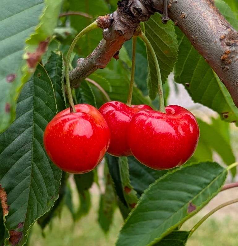Sour: the tart cherry typically used for pies and deserts in America is the Montmorency variety. They have a bright red skin. We have lots of those. They start to ripen about July 10 and we should have them till late July.