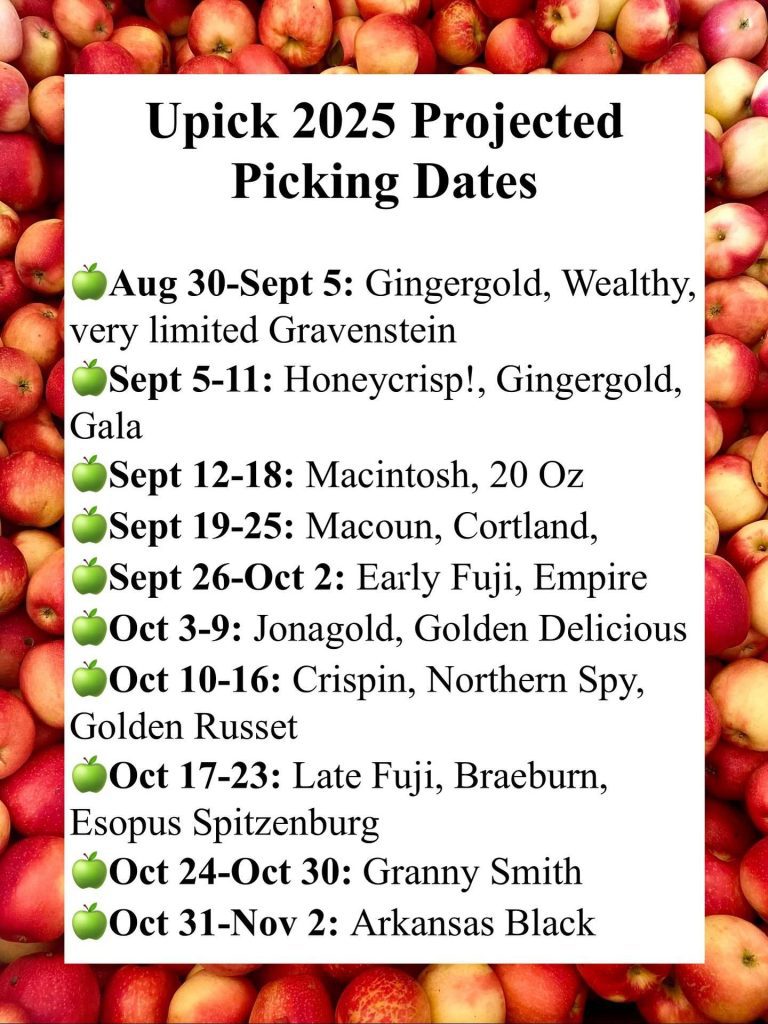 Here’s the LynOaken U-pick variety schedule. Note that this timeline is tentative, and can change with weather or picker volume. Follow LynOaken’s Facebook page for updates.