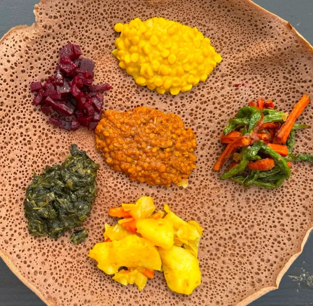 Abyssinian Ethiopian Cuisine: veggie sampler ($17.99), seven vegan vegetable marvels on injera, sourdough pancake made of teff and barley. As much as I dig meat, Ethiopian vegetable treatments are marvelous enough to me to go veggie when forced to choose.