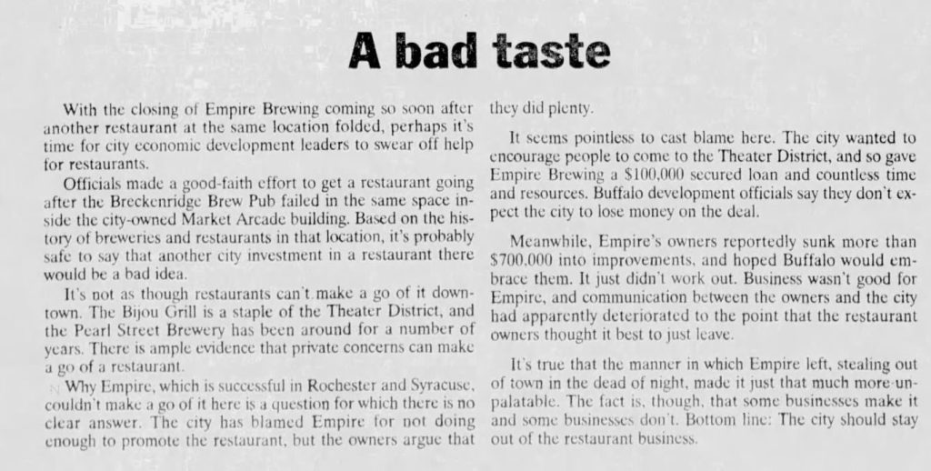 The City of Buffalo poured millions of dollars into the pockets of restaurateurs trying to succeed there. It became such a point of public humiliation in the heart of an allegedly resurgent theater district that The Buffalo News editorial board felt compelled to weigh in.