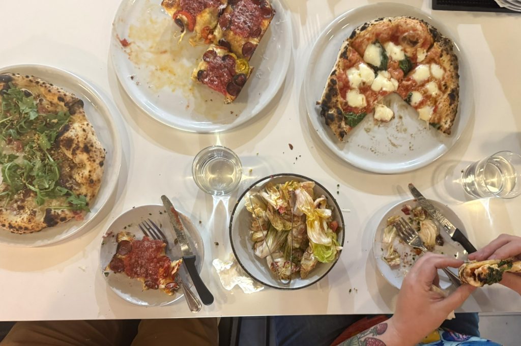 A: Jay’s Artisan Pizza counter would be my suggestion. Literally world-class Neapolitan and Detroit-style pizza. You can negotiate which two to get, and compare and contrast. If that doesn’t make chitchat easier, that’s on you.