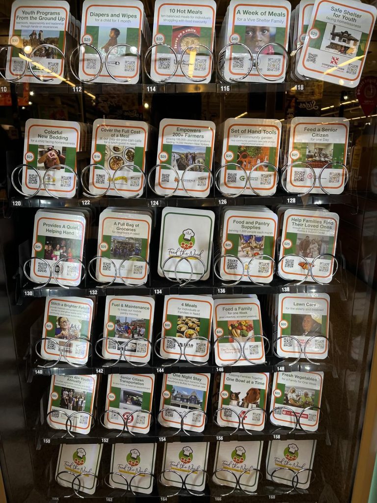 The self-serve charity kiosk lets givers support 24 different groups, in amounts from $16 to $40. Colorful new bedding for a child facing homelessness, $25 through Family Promise. Tools for beginning community gardeners, $35 through Grassroots Gardens WNY. A bag of groceries for neighbors in need, $25 through Buffalo Go Green.