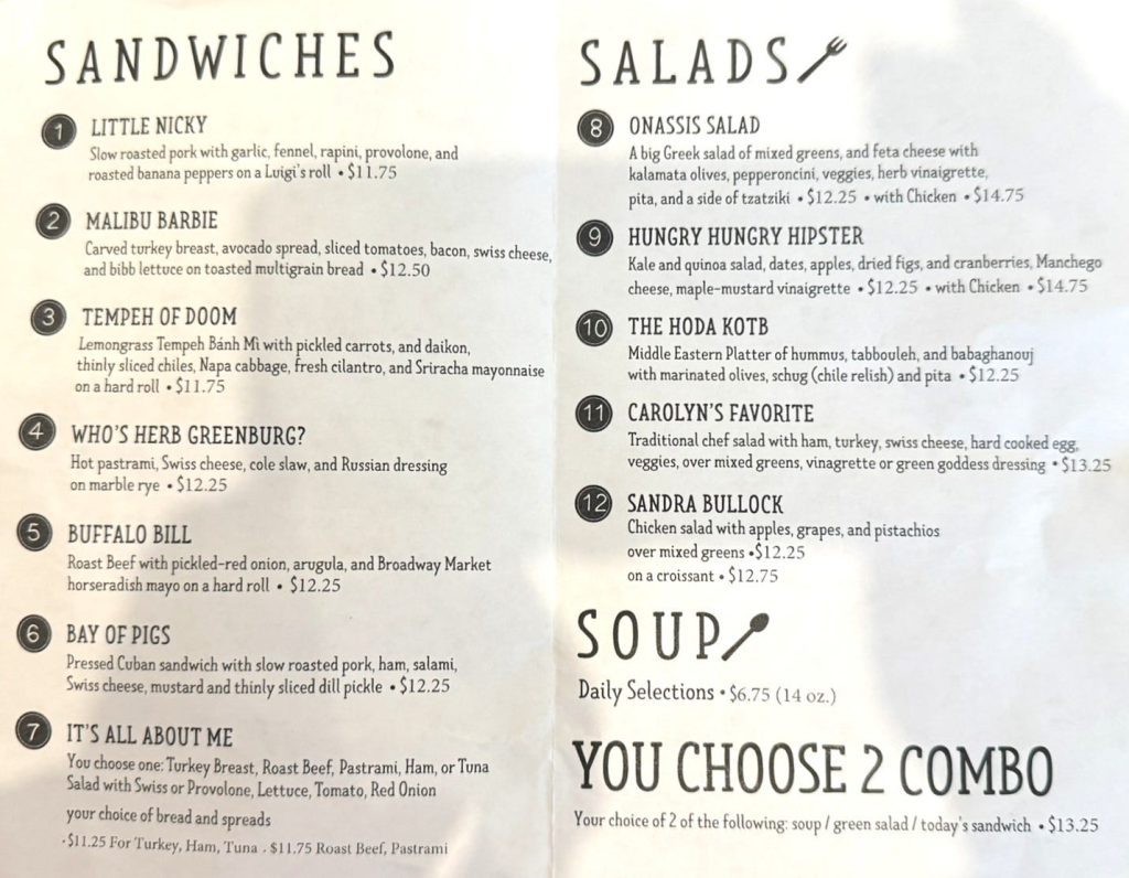 Here, diners can choose a hearty scratch-made lunch for $13.25: sandwich du jour, soup, salad: pick two.