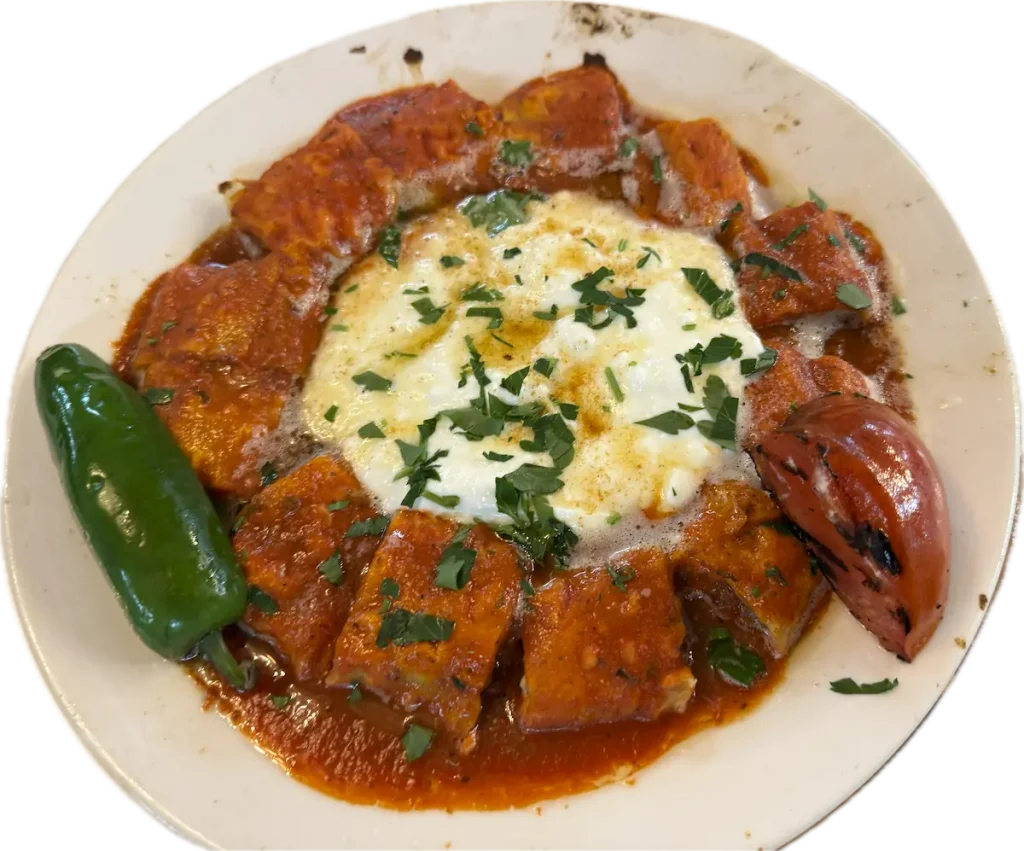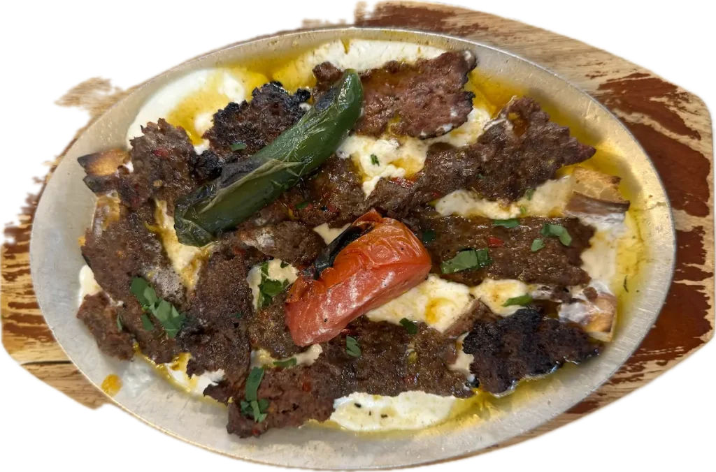 Iskender kabab ($19.99) layers gyro meat over yogurt and toasted bread, which is drenched in tomato sauce and clarified butter.