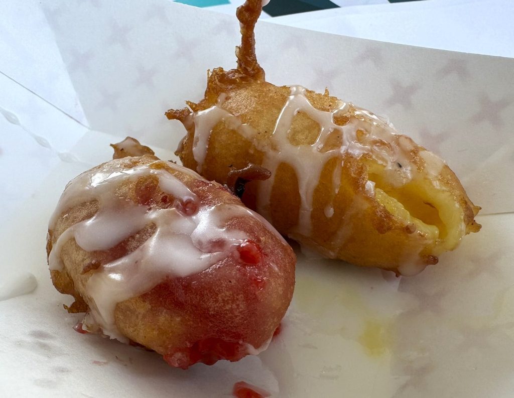 Clockwise from top left: Babcia’s Pierogi Hot Ones chile pineapple pierogi, Nick Charlap’s Dole pineapple whip with raspberry, Venus gyro and Greek fries, Not Just Cake cherry and banana cream fried pie bites.